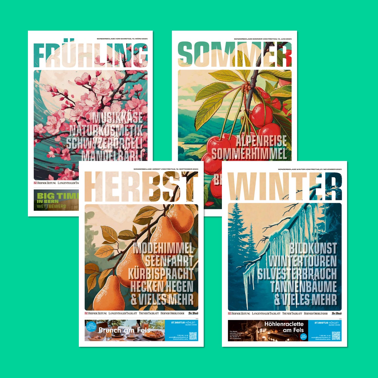 Four seasons, one region: the seasonal supplements for spring, summer, autumn and winter highlight life in the city and canton of Bern. Editorial content covering gastronomy, culture, leisure, sustainability and regional highlights combines information with emotion and captures readers’ attention.